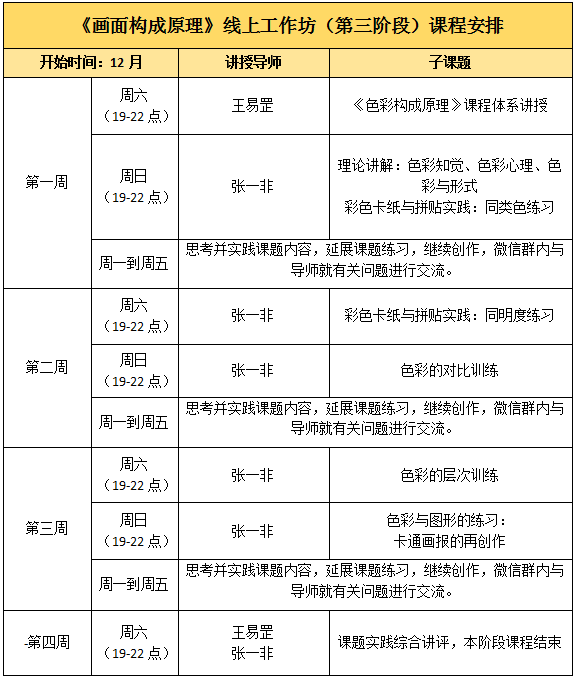 在新一阶段《色彩构成原理》的课题中,我们很荣幸的迎来一位权威导师,著名艺术家,鲁迅美术学院研究生导师王易罡教授,他将携手张一非老师共同执教。王易罡教授是当代最具代表性的抽象艺术家之一,他在青年求学时期就深入研究包豪斯理论基础,并将约翰·伊顿的经典著作《色彩艺术》的核心内容融入到毕生教学之中,他非常注重基础理论的教学,授课风格风趣幽默,擅于用平实的语言传递深刻的哲理,用身体力行的实践方式向大家传授自由的创作方法,受到学生的广泛好评。