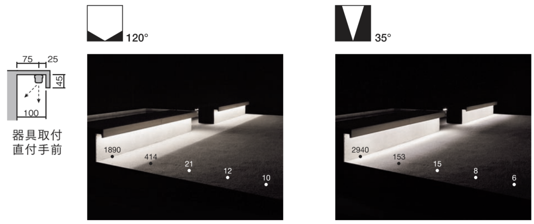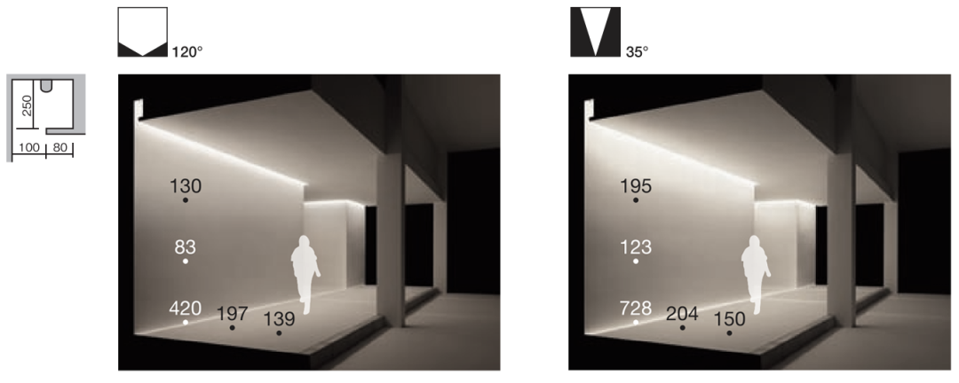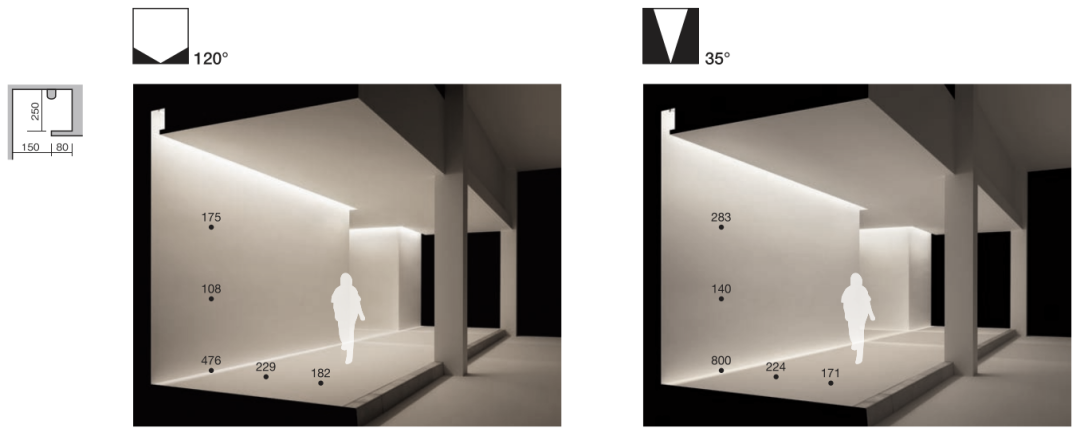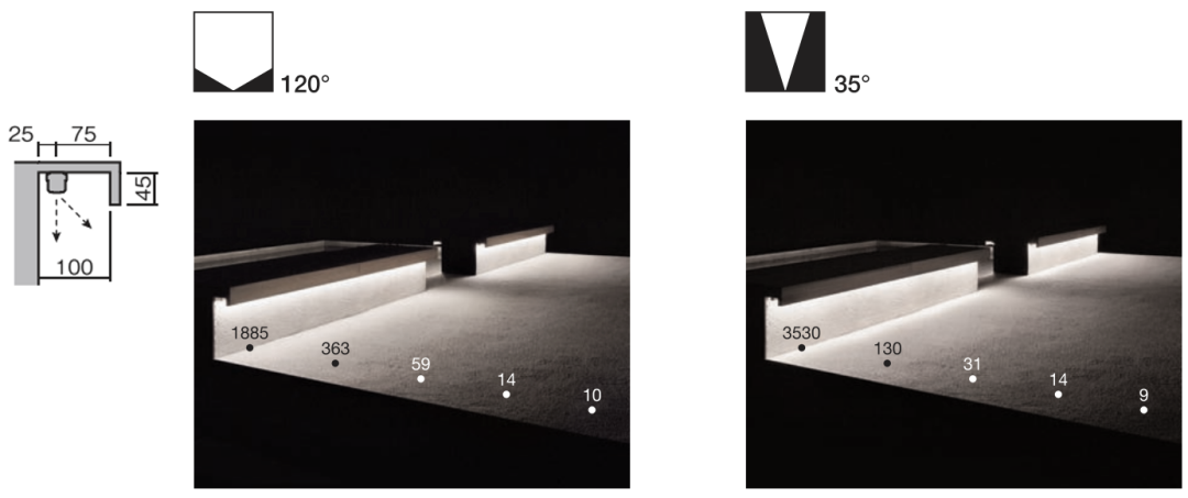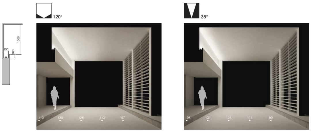 下图为灯具安装在灯槽内侧时模拟结果,采用120°光束角照明效果更加柔和,而35°光束角照明在地面产生顶峰光;