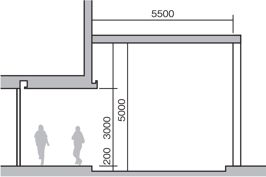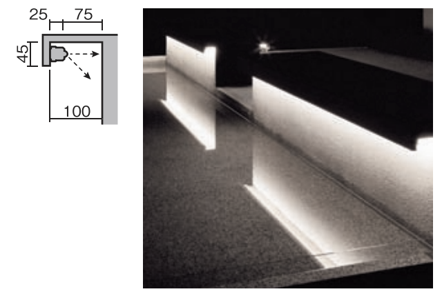 下图为车库剖面图,右侧为车库空间,采用上照墙壁和天花的方式照亮车库空间;左侧为走廊空间,采用下照方式照亮地面。