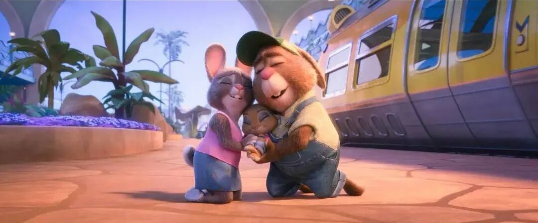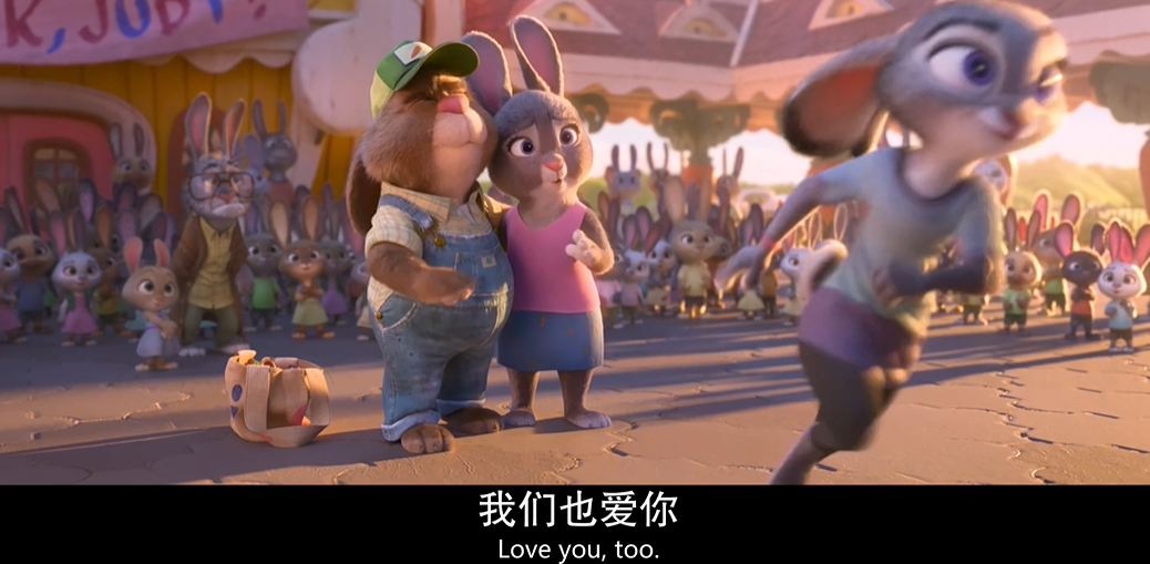 然而正片中在车里听歌的朱迪不知道的是,自己的小妹妹竟然跟进来了,而兔爸兔妈则在火车后面拼命地追赶... 在成功救回朱迪小妹妹后,兔爸兔妈目送着朱迪的背影,生性怯懦而不愿离开故乡的她们,好像也继承了女儿的勇气。