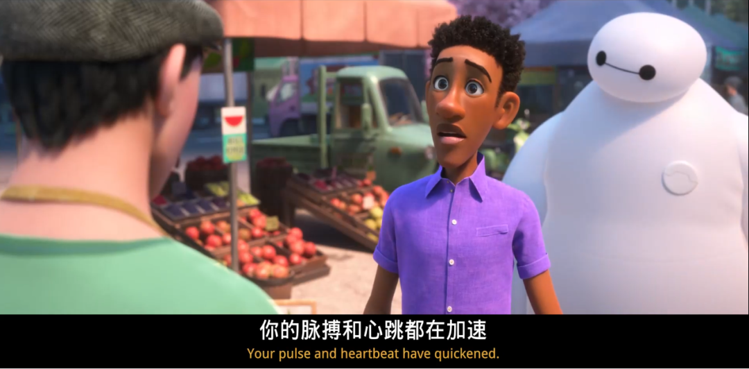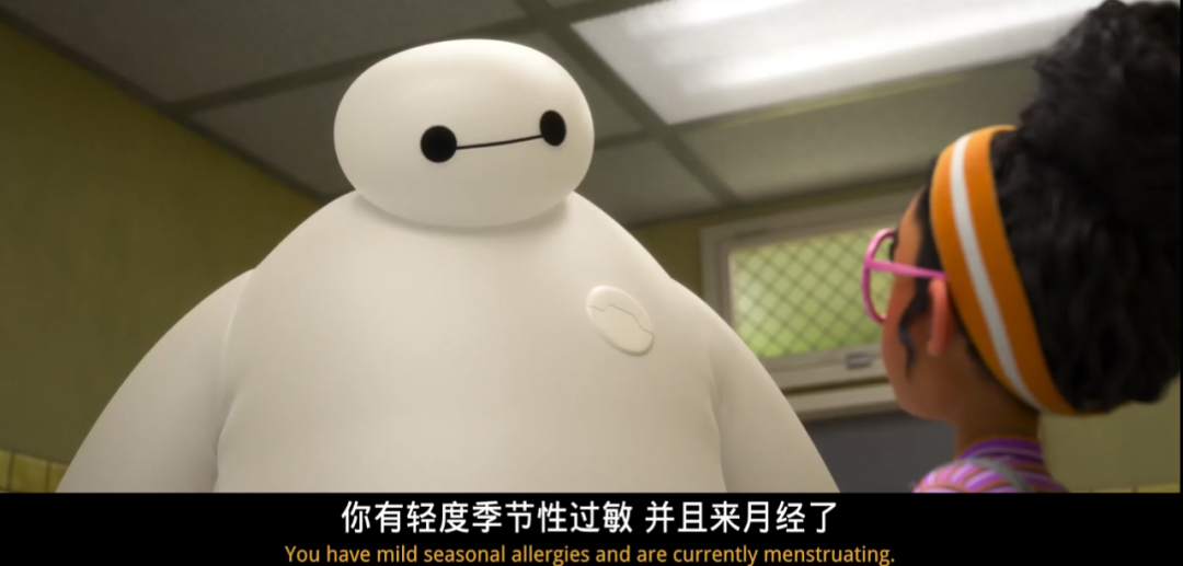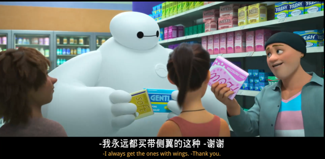 大白鼓励,然后去超市给小女孩买卫生巾,还得到了女孩,女孩的妈妈,甚至一个变性人的指导,仿佛买卫生巾这件事是一次以呼吁平等,拒绝歧视为主题的团建。