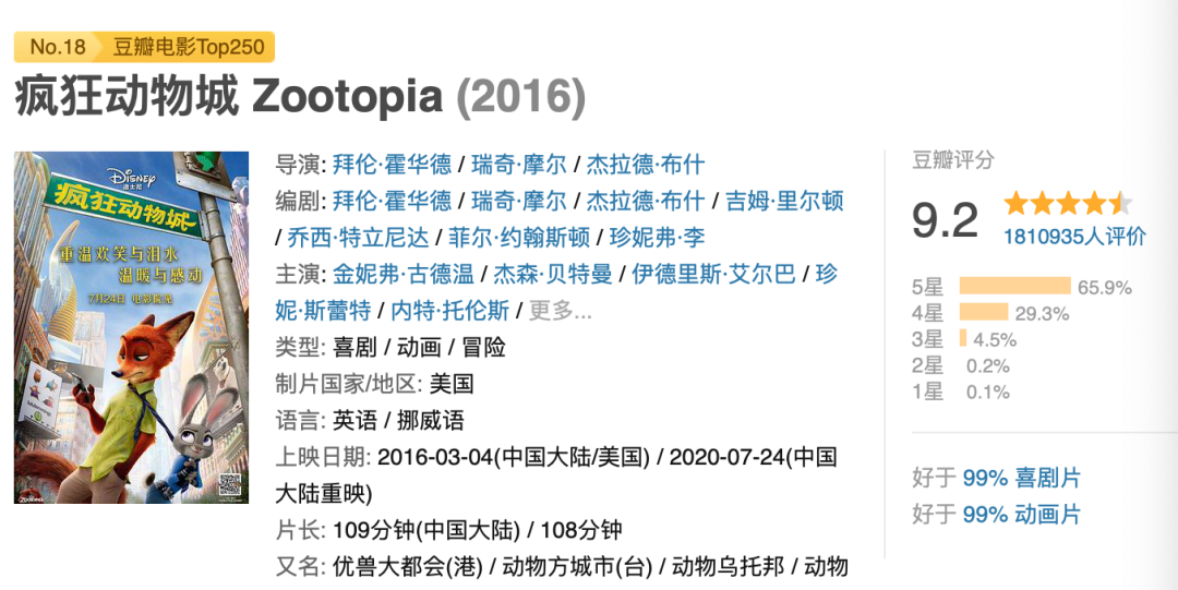 这是那年的《疯狂动物城》让人印象深刻的画面之一。《疯狂动物城》在豆瓣电影TOP250榜单内,100多万人打出了9.2的高分,影响力可见一斑。