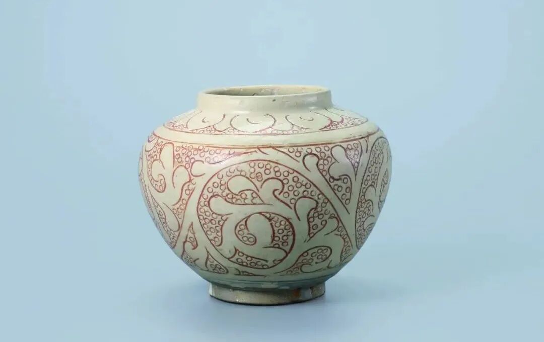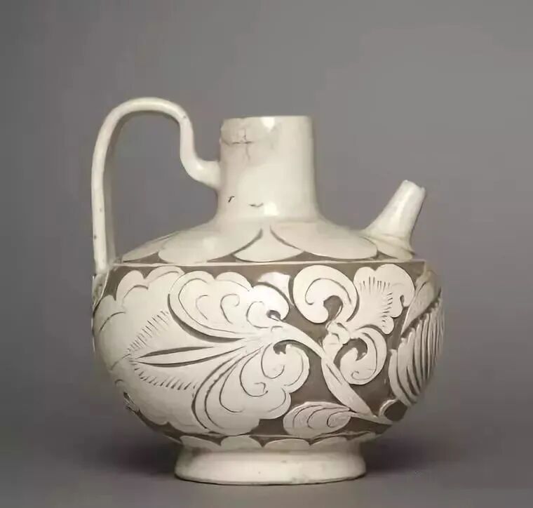 ▲宋代白剔花(深剔)卷草纹水注(壶)