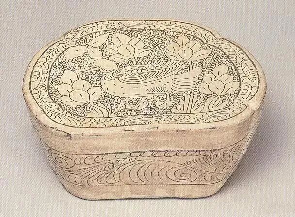 ▲宋代曲河窑珍珠地划花鸟纹枕