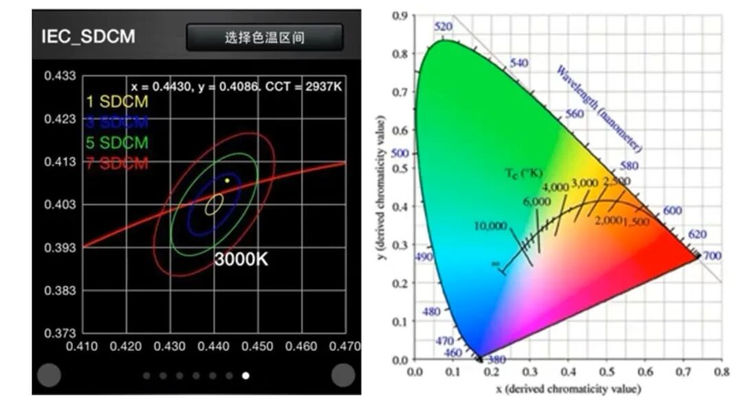 表征一批光源中,各光源与光源额定色品的偏离,通常色容差越小,准确度越高,品质也就越好。