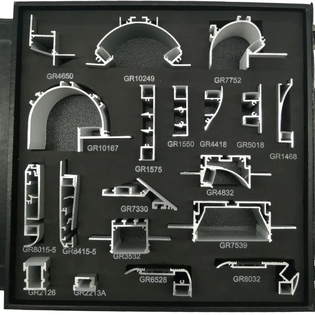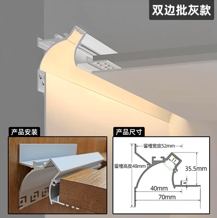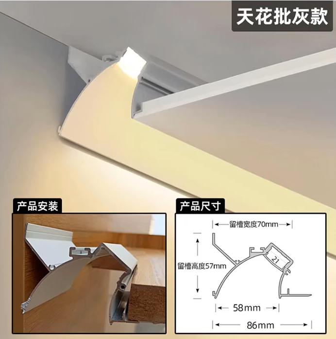 建筑照明一体化型材的种类丰富,主要包含半圆款型材、护墙板款型材、预埋款型材、双边批灰款型材、单边批灰款型材、反光槽款型材、偏光洗墙款型材、悬浮顶款型材。