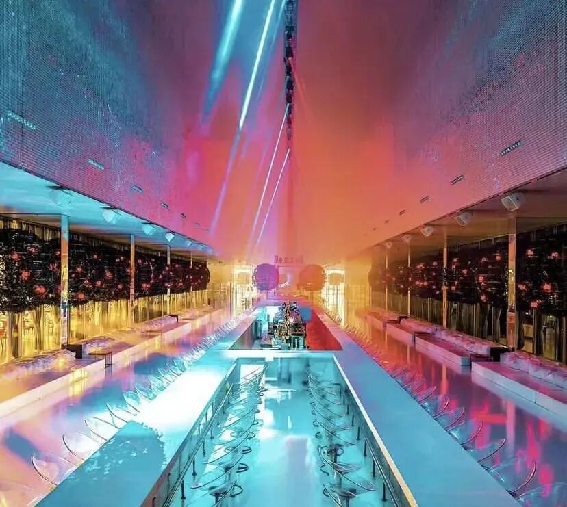幕墙折射出的迷幻奇境是客人观看演出的极佳地,香槟喷涌的泡沫与爱侣之间的欢呼交织在一起,甚至还上演着钢管舞秀等时尚表演,这里被称作“苹果花园”。
