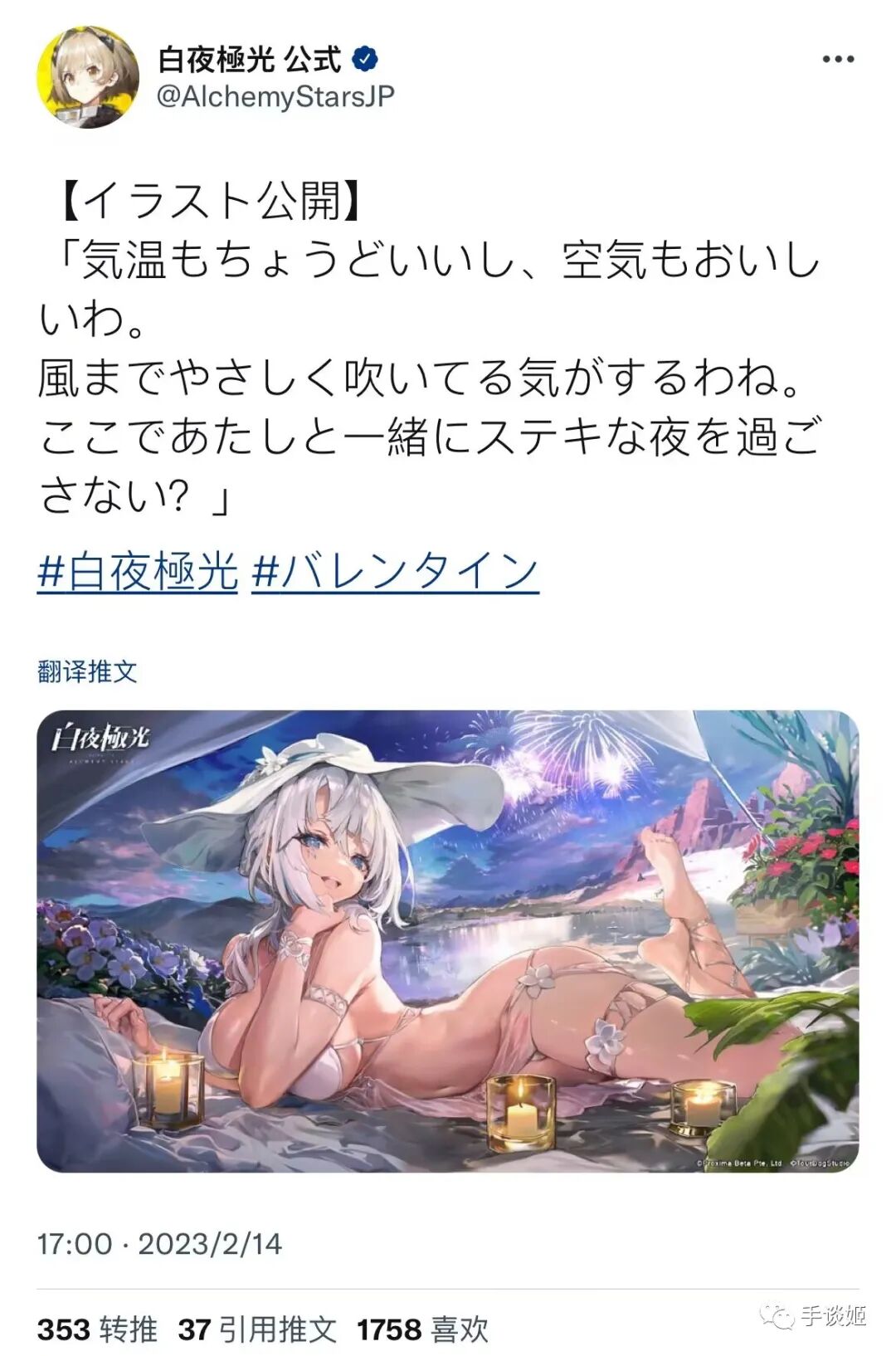 2月14日,手游《白夜极光》在推特上发布了一张情人节贺图。《白夜极光》是一款由腾讯旗下巡回犬工作室开发的战棋类角色扮演抽卡手游。这款游戏在两年前在海外上线,在今年一月获得了国内的版号,按道理近期应该就会推出国服吧。