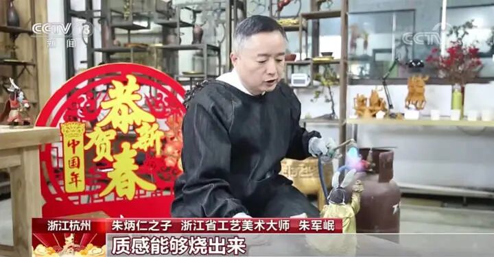 朱炳仁介绍,“兔俊俊”单是设计,就花了半年的时间,生产起来更是复杂。制蜡模、焙烧、熔铜、浇注、清砂、着色……制作一只铜兔子,生产过程就有三十多道工序。在非遗工坊,朱军岷一步一步大秀绝活,特别是釉彩铜高温着色技艺,十分考验匠人对温度的控制。“边上釉边高温热着色,所以它的温度能够控制在让铜不至于熔化,(但)釉料能够结晶,质感能够烧出来”,朱军岷介绍。这位子承父业33年的正高级工艺美术师,刚刚,他的工作室被新认定为25家“杭州市技能大师工作室”之一。