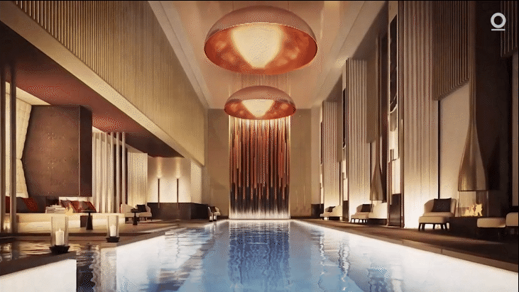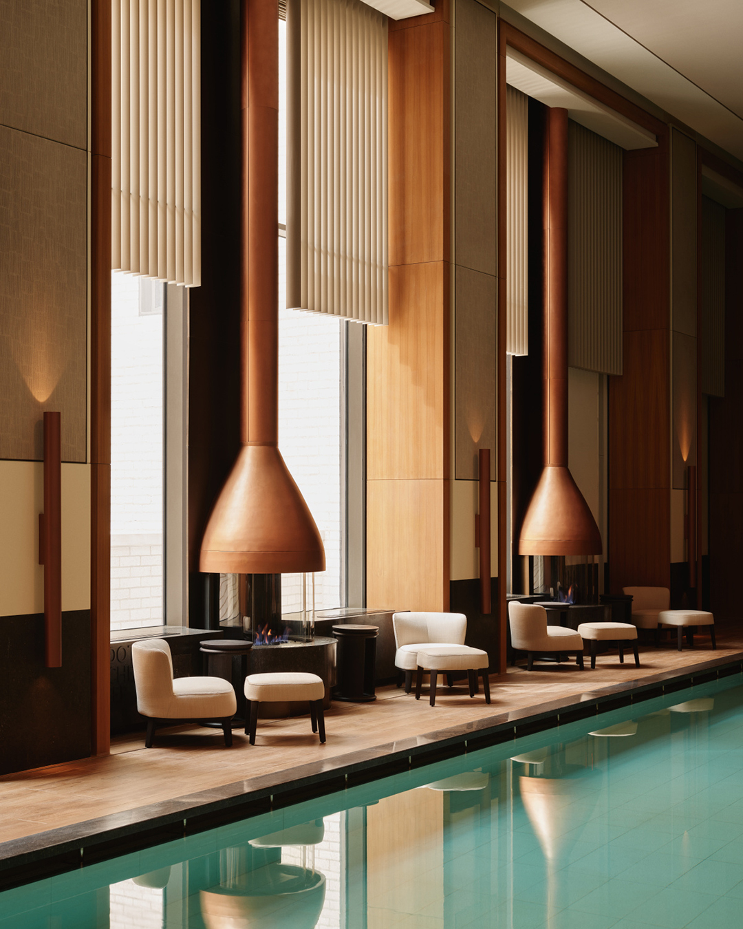 水疗中心包含一个 20 米长的室内游泳池,巨大的哑光金属饰面吊灯悬于碧蓝池水之上。空间有着隐逸的东方意趣,镀金时代的气质被收敛在安稳有序的节奏中,借由材质和肌理,将奢华与庄严,克制与安定联系在一起。