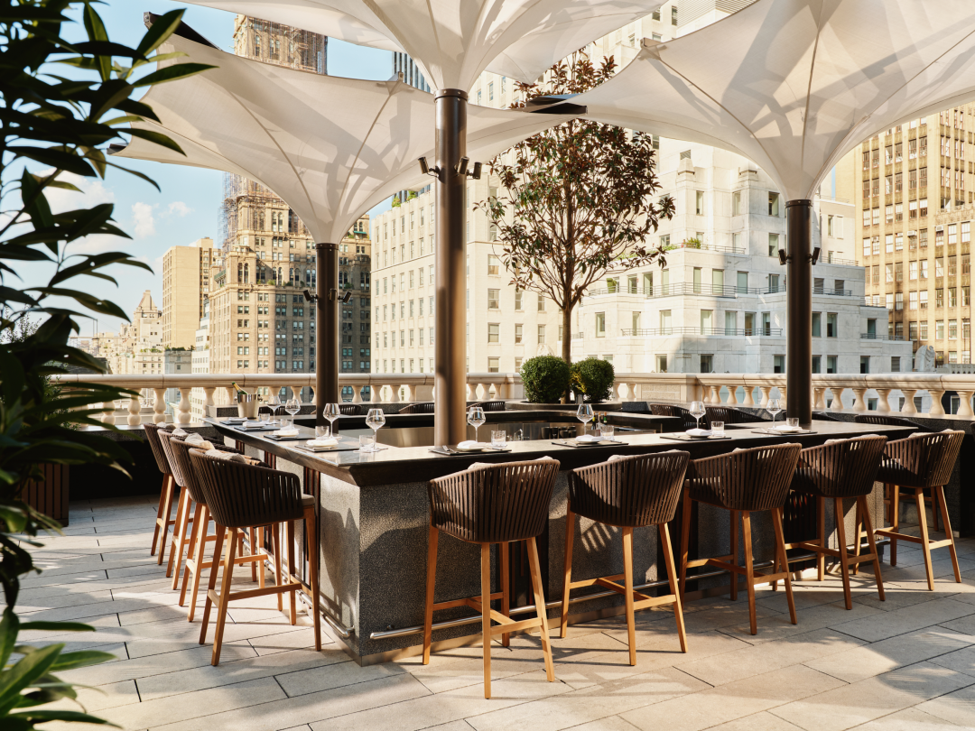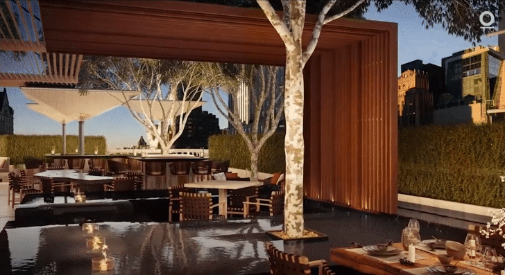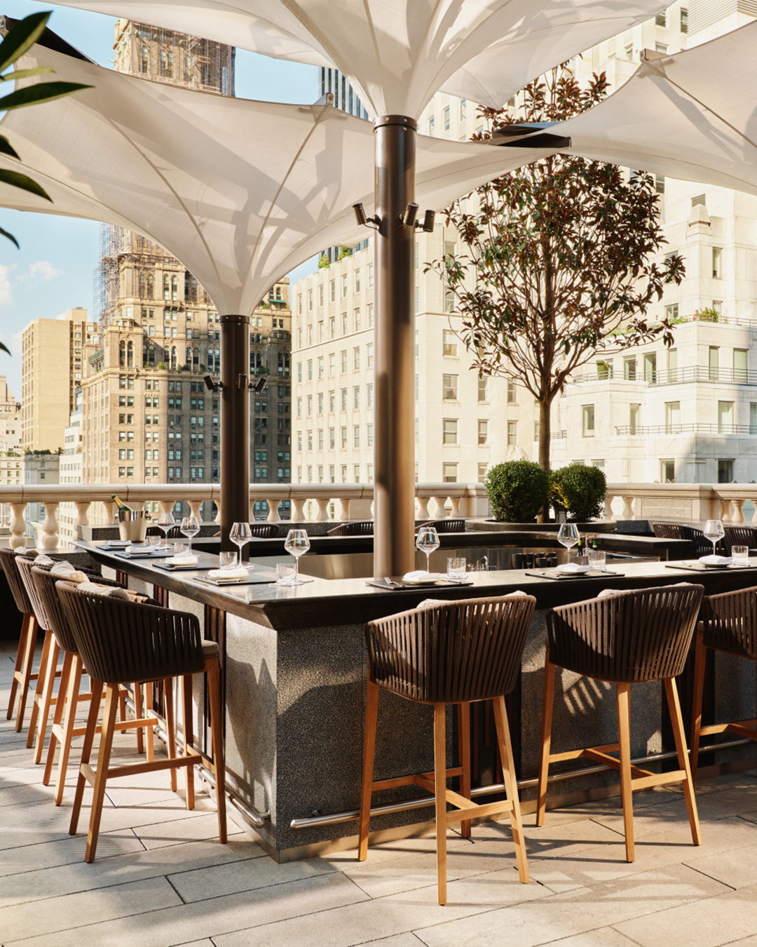 环绕式花园露台是酒店的最大特色,同时,基于独特的城市景观而设计一个可以欣赏到完整中央公园景色的露天酒吧。Jean-Michel Gathy融合了水景和中央火炉等元素,营造出强烈的视觉叙事和空间能量,进一步丰富了户外的人造环境。