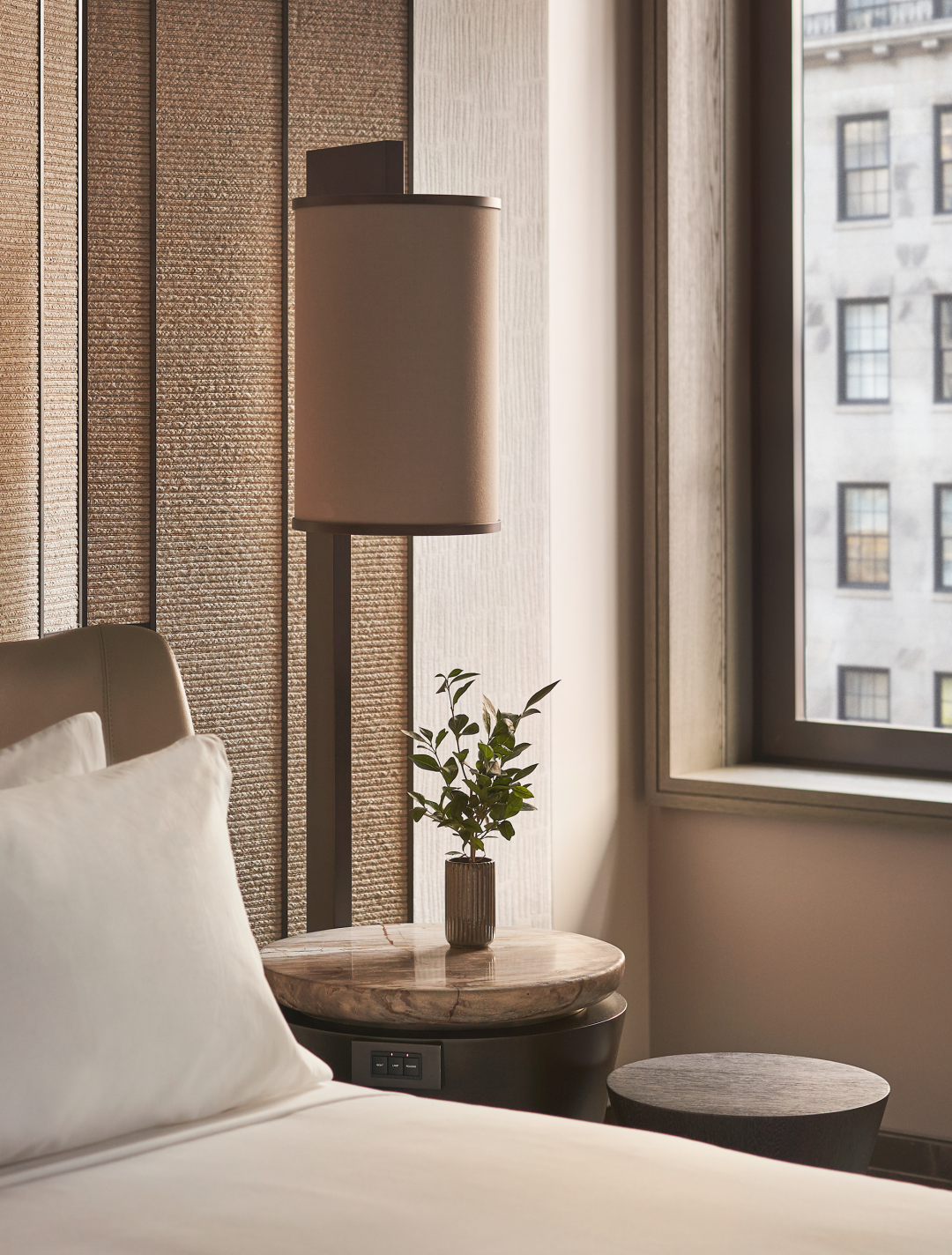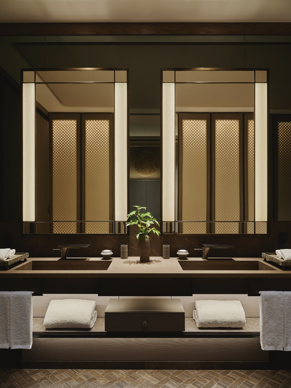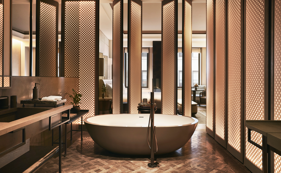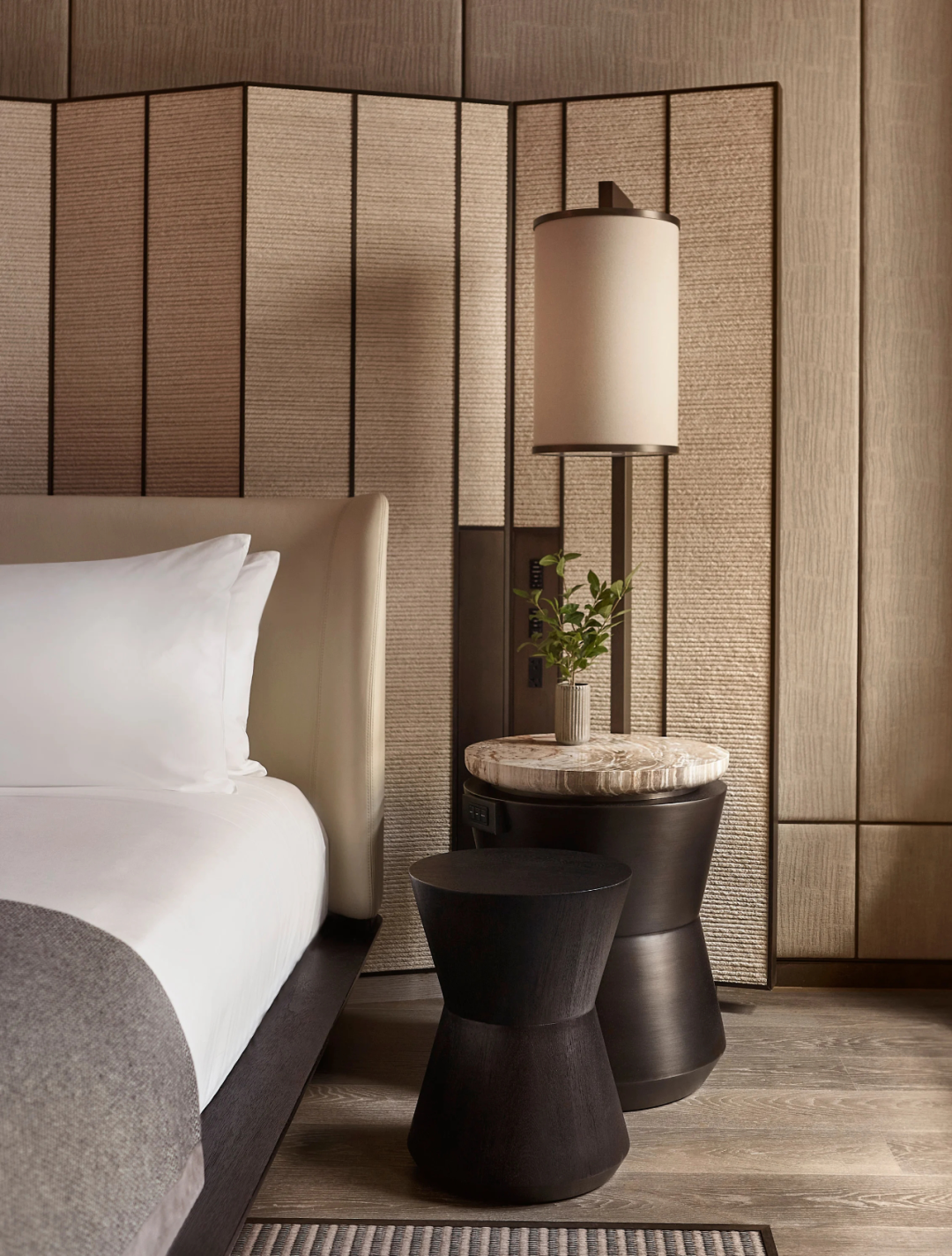 屏风门是Jean-Michel Gathy空间术语中的重要元素,其能让空间在通透和私密中切换自如,也把分隔空间的自主权交由住客自己。让空间随功能需求和心境变幻灵活调整。这一元素也运用在安缦纽约起步客房的浴室和卧室边界处,让浴室和居室空间若即若离,烘托出空间层次之美。