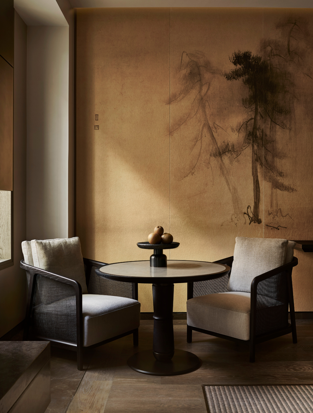 如水墨扇面的抽象画作与空间中细密的条纹均质肌理相呼应,安缦在浮华城市中心,唤起的是如桃园般的平和奢华和东方智慧设计师巧妙地取水、火的元素弥合室内与室外。