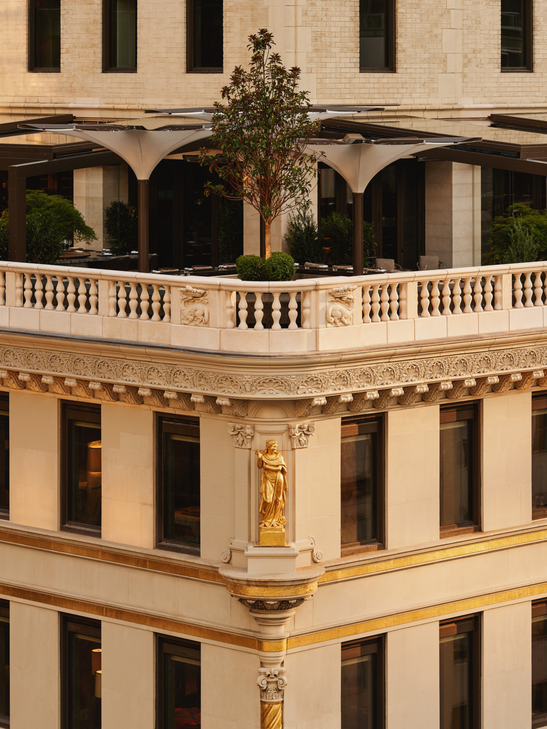 安缦(Aman)一词源于梵语,意为「安宁、平静、庇护」。酒店入口处鎏光的几何金属饰面,同时传递出安缦的东方文化起源,象征纽约“镀金时代”的辉煌,以及安缦酒店中“和平”的品牌文化。