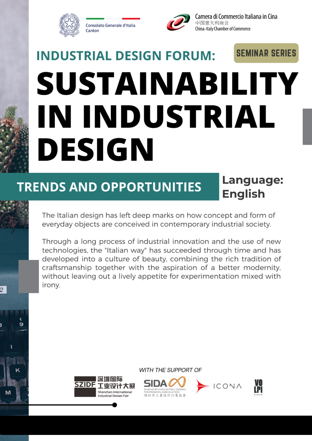 10月20日,中国意大利商会与深圳市工业设计行业协会(SIDA)联合举办了“工业设计论坛: 工业设计的可持续性、趋势和机遇”线上研讨会,共同探讨新形势下中意设计行业的发展趋势,探索工业设计中的可持续发展、趋势和机遇。