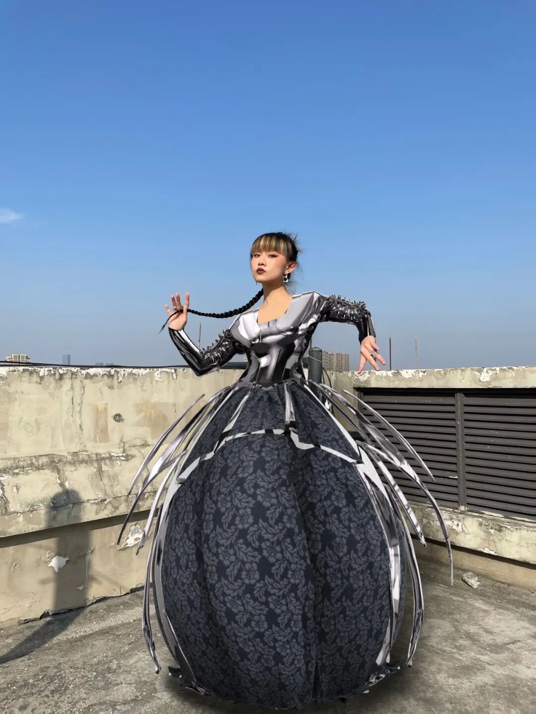 时尚博主@Kira岐牙身穿着HAIZHEN WANG X DESIGNVERSE 2022AW 虚构剧场系列优美亮相,创新金属材质与经典制式裙装巧妙糅合,显而易见,它是一件突破想象空间的精妙时装,但是,这么美妙的设计在镁光灯中炫耀下才有价值吧?