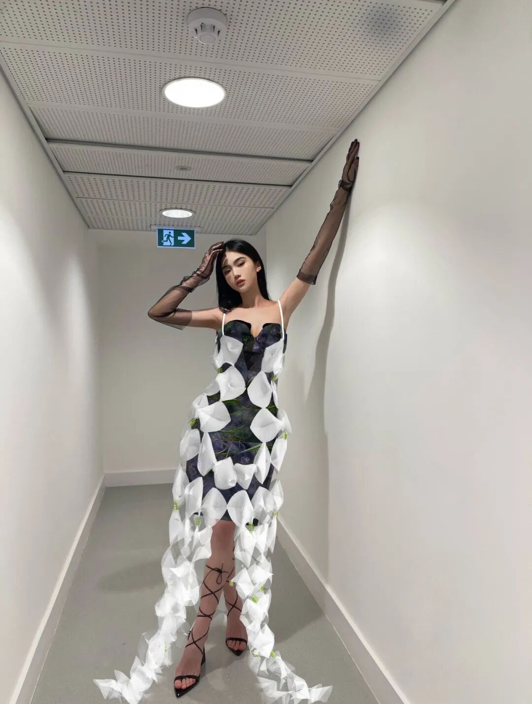 时尚博主@imeating 身着SHIE LYU X DESIGNVERSE 2022AW 编序生长系列,紫黑色植物材质纹理点缀裙身,白色花瓣裙摆裹挟自然之感。