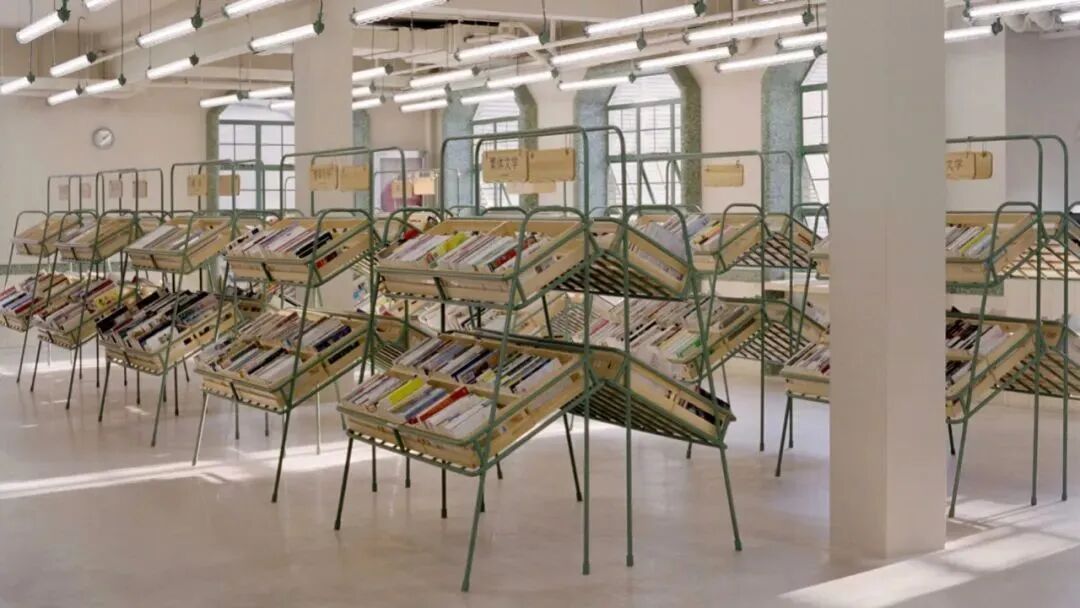当地工作室 Offhand Practice 旨在通过模仿去超市的体验来营造轻松的购物环境。衣服和书籍陈列在类似水果和蔬菜箱的架子上。
