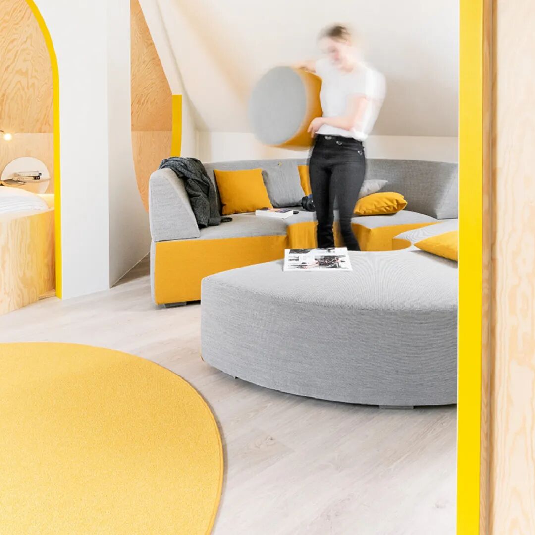 Van Staeyen Interieur Architecten 在位于安特卫普的阁楼翻新中采用了拱形门户、弯曲的家具和黄色装饰。