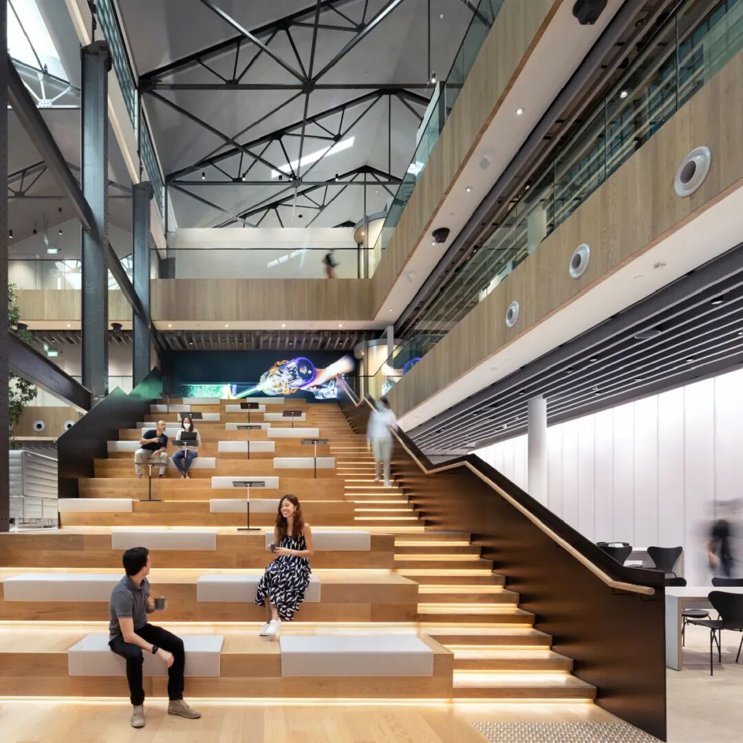内部设有圆形剧场风格的座位,以鼓励非正式聚会,并在前涡轮机大厅内设有雕塑般的螺旋楼梯。