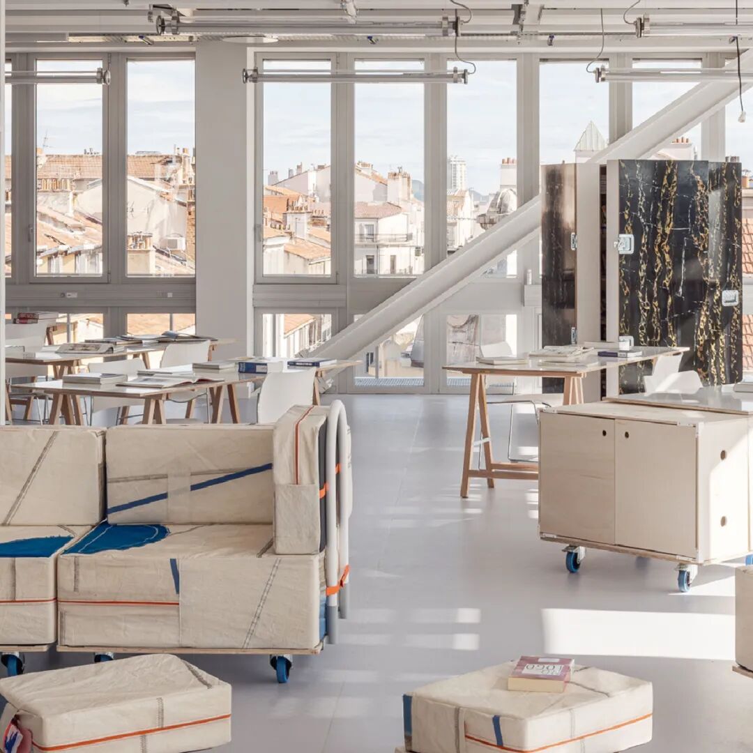 Émilieu Studio 设计了位于法国 Toulon 的 Camondo Méditerranée 设计学校的室内。该工作室旨在创建一个大型灵活的学习空间,仅使用可重复使用的当地材料进行布置。该项目以移动家具系统为特色,可以轻松地在户外组装、运输和部署。 家具由当地采购的建筑边角料制成。