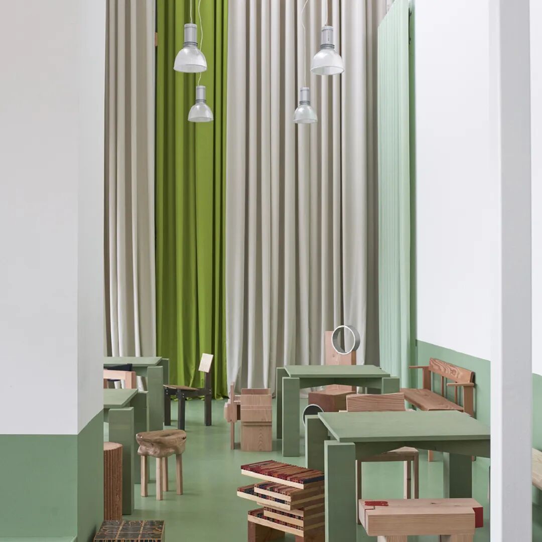 这家咖啡馆探索家具如何也可以成为艺术品,并设有由 25 位设计师用边角木料制作的椅子。