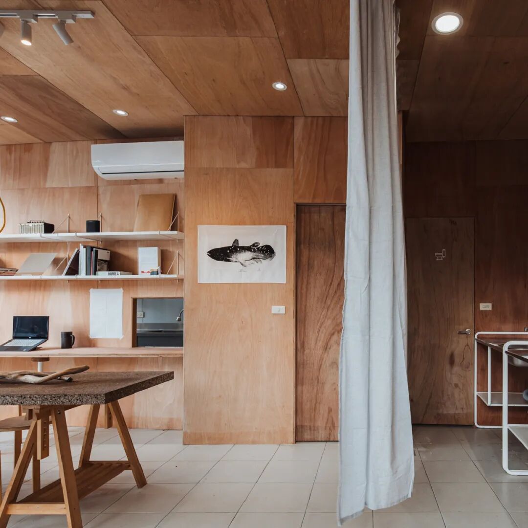 这个 53 平方米的场地几乎完全用暖色调的胶合板衬里。 工作区尽头的胶合板隔墙配有书架和连接厨房的小舱口。
