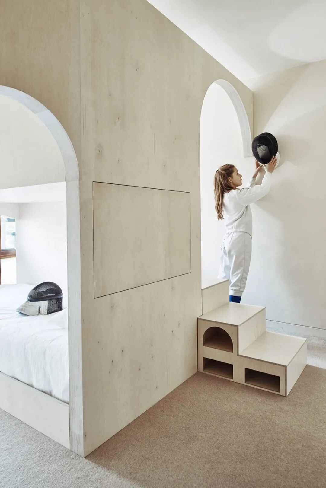 胶合板结构为孩子们提供了一个睡觉、学习和玩耍的地方,同时又可以整洁收纳。