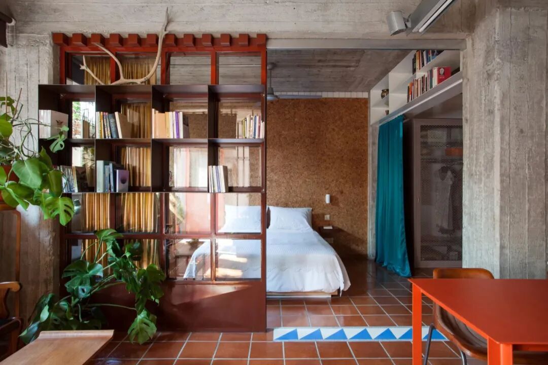 用一个高至天花板的储物柜把卧室与主生活区隔开,并将其设计为推拉门样式,以保证睡眠区的隐私。