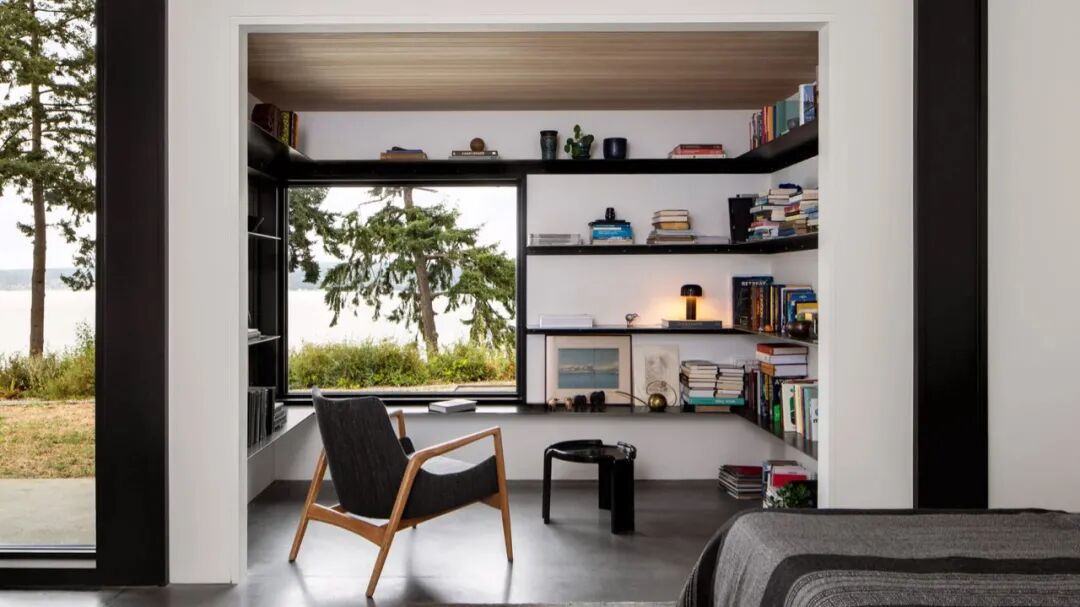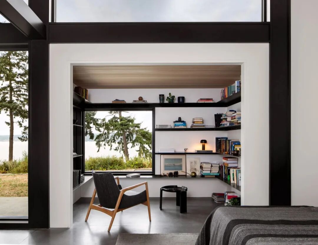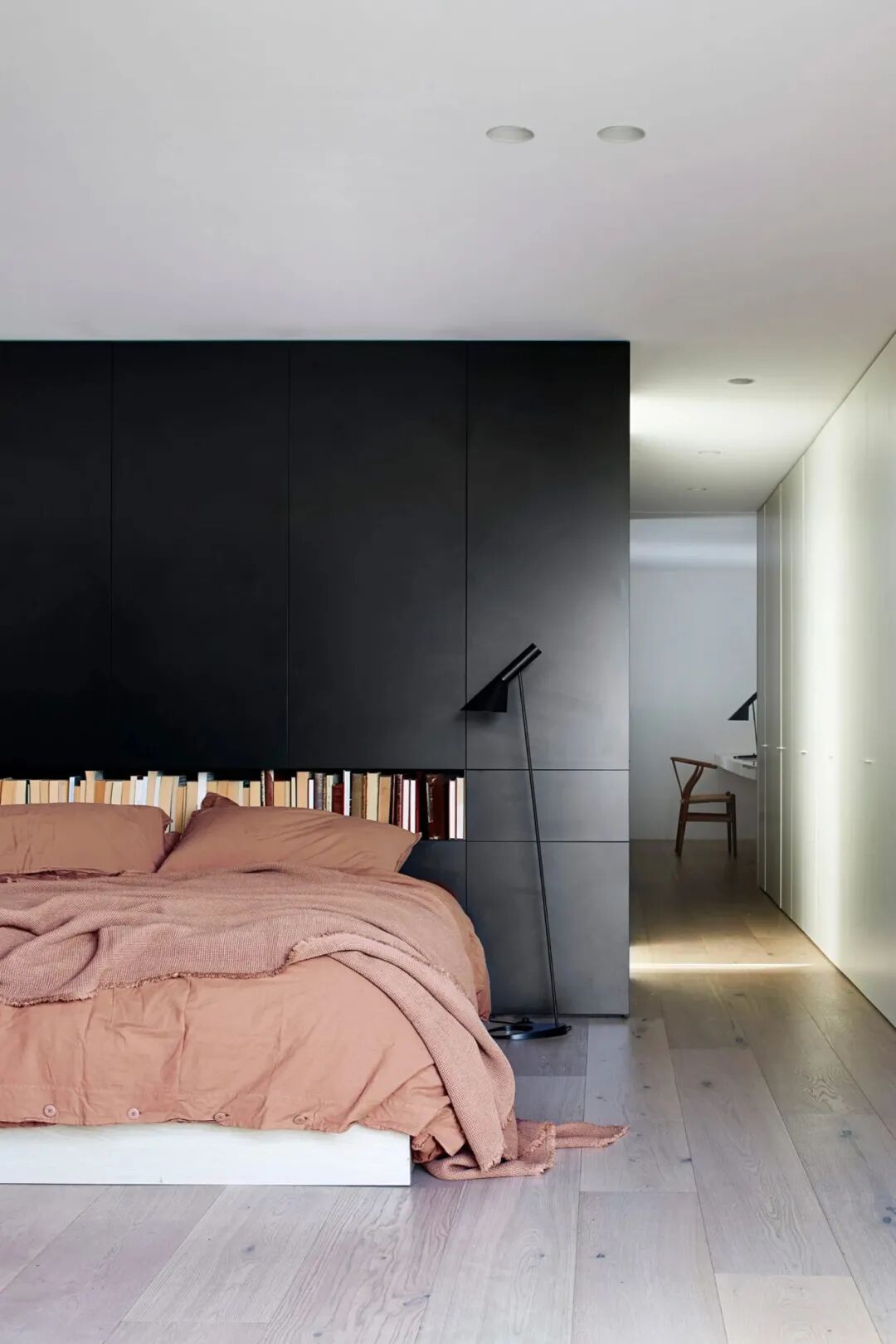卧室里有一个巨大的图书角,内有一排排书架通向睡眠区,坐在这里,可以欣赏窗外宁静的风景。固定装置和建筑元素被漆成黑色,与白色墙壁形成了鲜明对比。