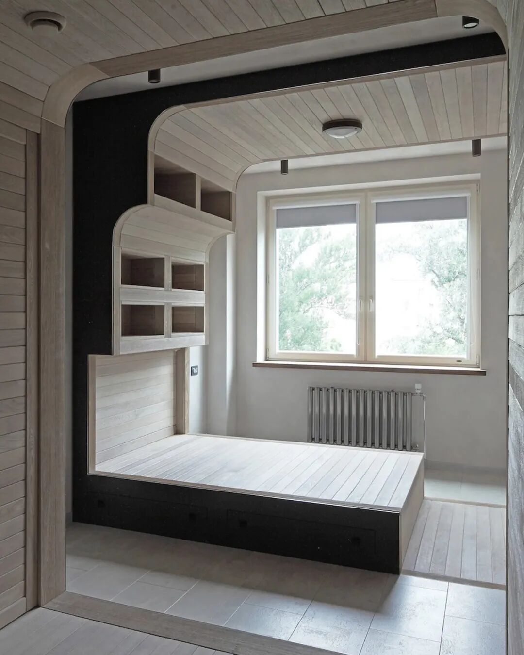 俄罗斯建筑师 Peter Kostelov 用木质胶囊式结构翻新了这套位于莫斯科的公寓,在把客厅加高的同时,还衍生出了内置家具。