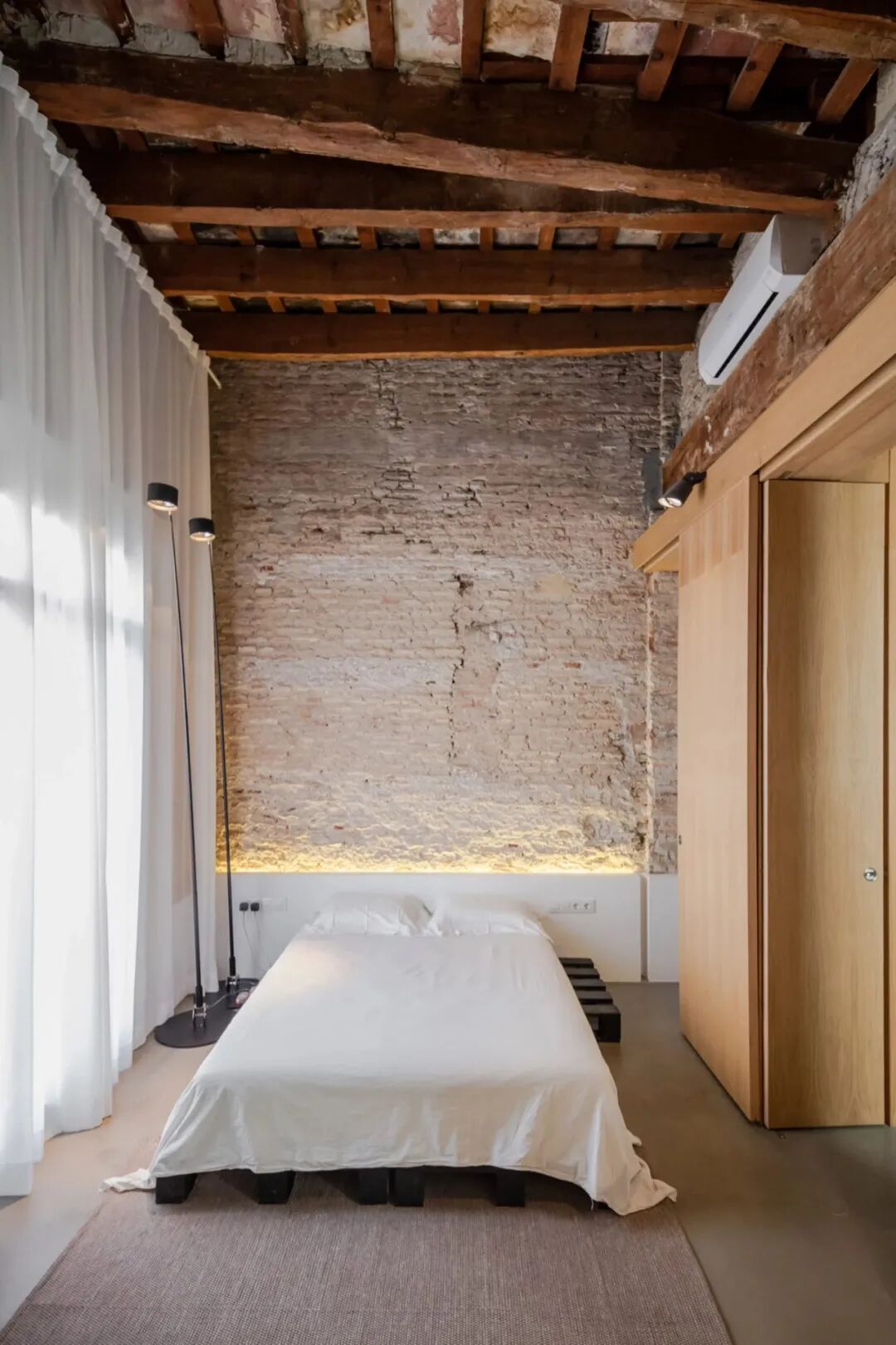 房间中央有一面深色墙壁,背后隐藏着步入式衣柜和浴室。