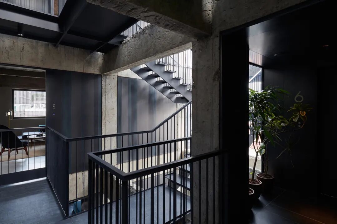 穿过巷道步入酒店后,访客站立于公共空间,视线随着轴线向上移动。原本将各楼层连接起来的楼梯井,被切割、扩宽,创造出全新的垂直庭院。