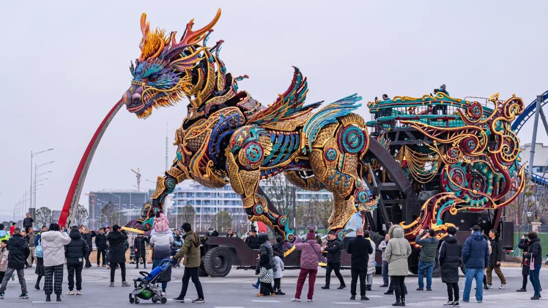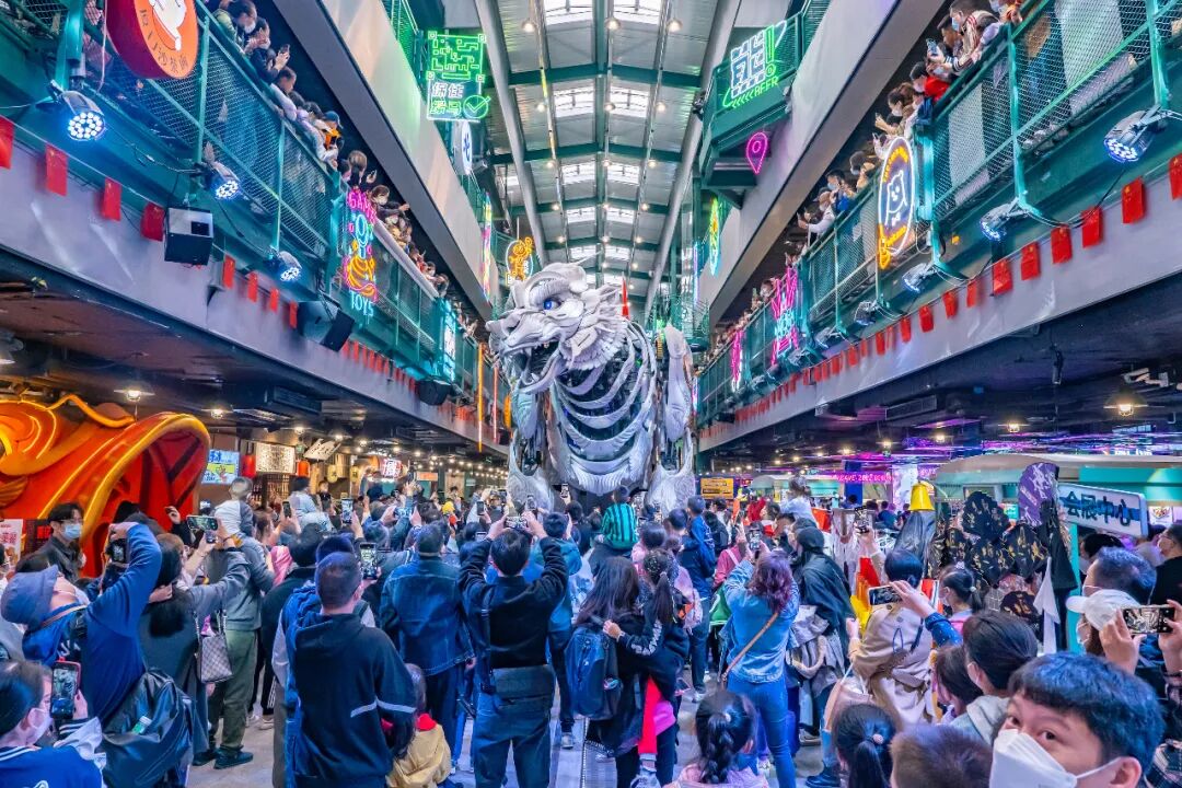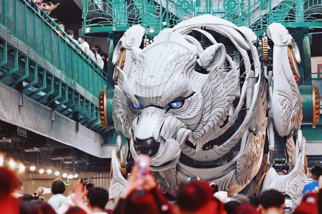 去年在大连冰山慧谷熊洞街推出的巨熊北北在四个月的时间内吸引了 60 万人。这个身高 7.14 米,重达 25 吨的巨兽装置是首个为室内街区环境打造的电控轨道式行进的机械巨兽。