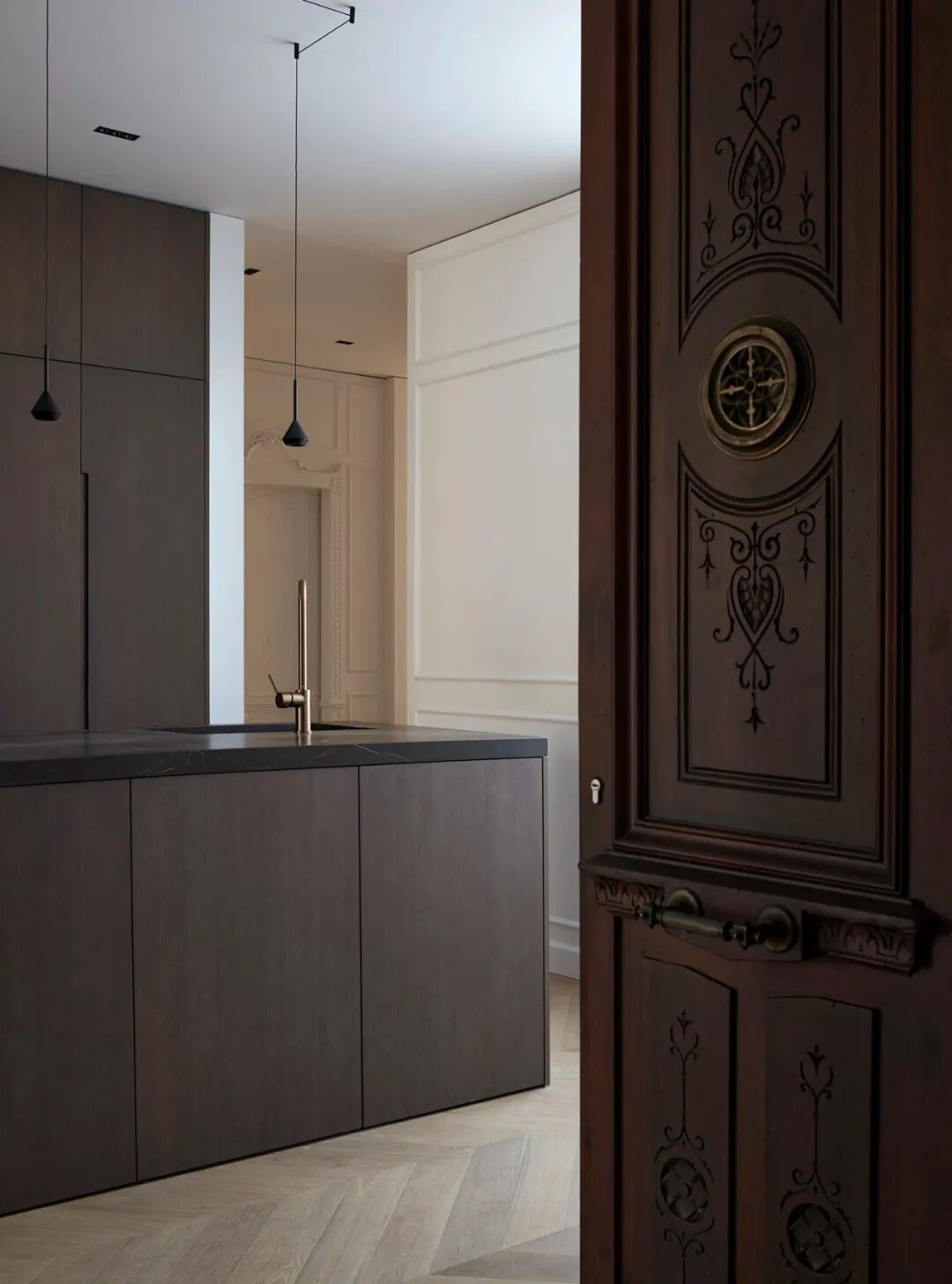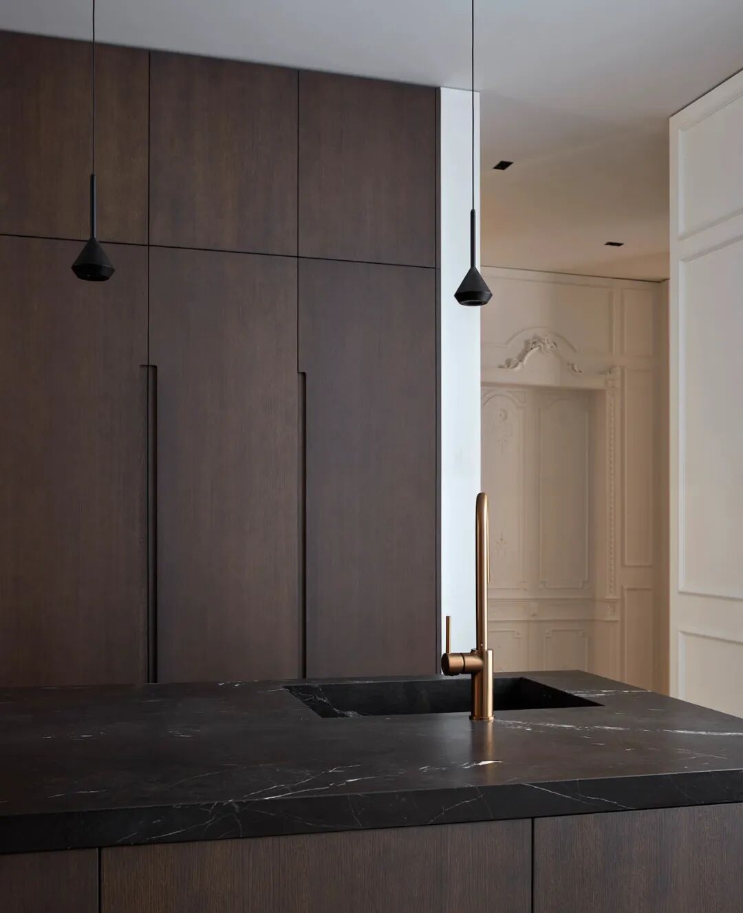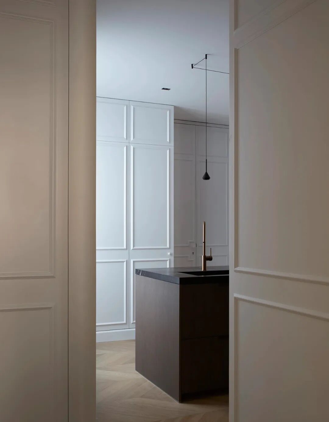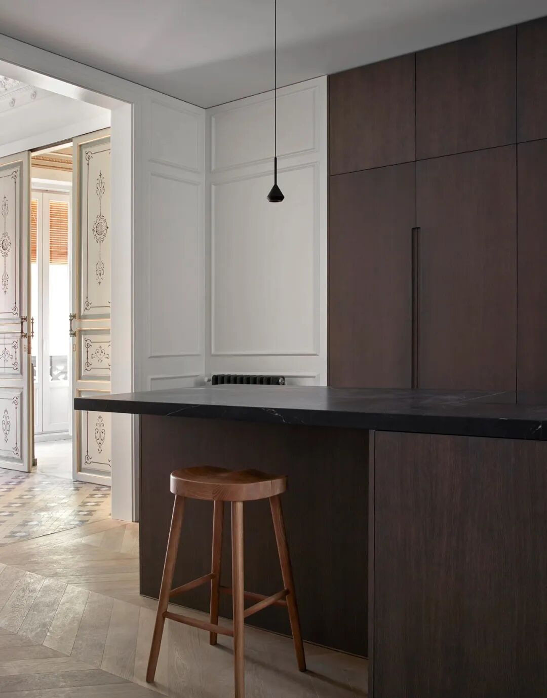 The area where the current kitchen is located is a space carefully designed by the architect, because it must become the link between the new space and the original space of the house. A series of panels are used to integrate kitchen area, bedroom door, entrance, bathroom, laundry and other parts of the cabinet. The system they used to design these panels was very similar to the system used in the original panels in the study area, which integrated doors, cabinets and shutters. For owners, the kitchen must be an important area of the house, because they like to cook, and they want it to be closely related to the living room area and the rest of the house. The kitchen designed in cooperation with Valencia Mobalko consists of a pillar area, which is integrated into the wallboard system, and a middle island as the central element of the space.