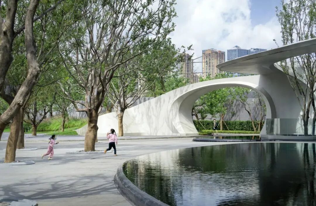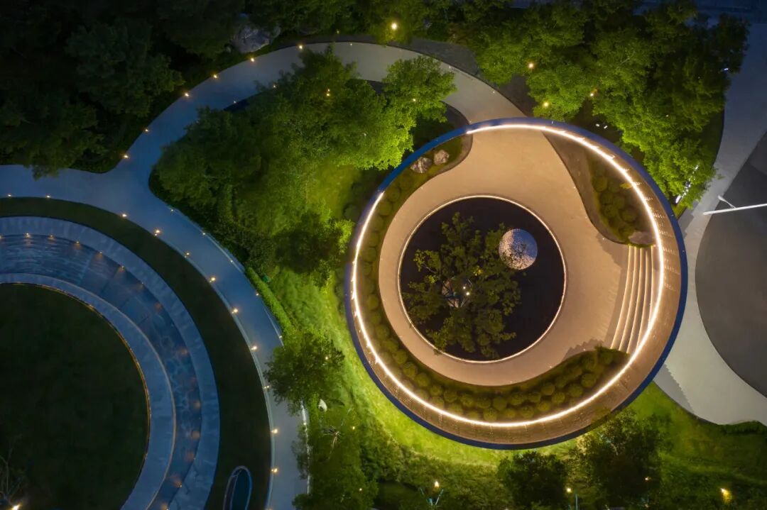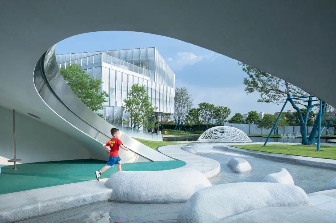 项目坐落在广州最大的人工湖白云湖畔,作为一线观景社区,展示区空间延续白云湖的生态诗意。设计灵感来源于湖升霁月,月起潮生,即以“引力公园”为名,以地月引力为体验故事线,同时响应国家关于建设“儿童友好型城市”的号召,融合云湖诗意与功能体验,打造可观可赏可游的互动地景公园。