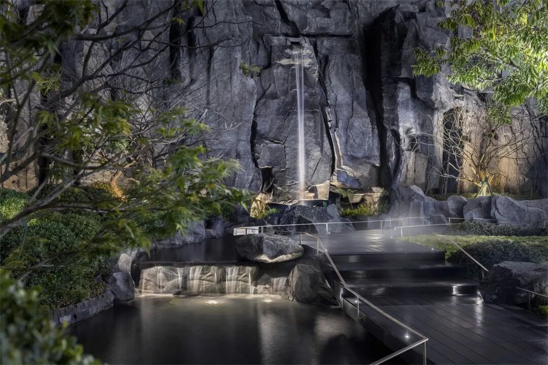 景观被嵌入到建筑之中,与建筑、室内共同营造出一个设计一体化,气质相似的场景体验。设计从感性的场景画面感入手,希望通过对自然及野奢酒店的还原及提炼,汇集出融于自然的美好生活场景。通过对自然材质的还原,将原石、植物、木材等质感与现代的金属、石材工艺相结合,实现亲自然的景观意境。