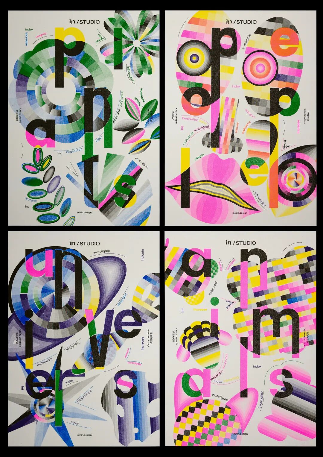 "A group of young people who love design gather here. They use print, image, video and other media to link art and brands, and create a diversified visual communication community space." Our design is inspired by the above idea of the Studio, which also guides us to build the brand image. In this batch of posters, we start with the word “crazy” and create four scenes of crazy plants, crazy humans, crazy universe and crazy animals through graphics and chromatography.