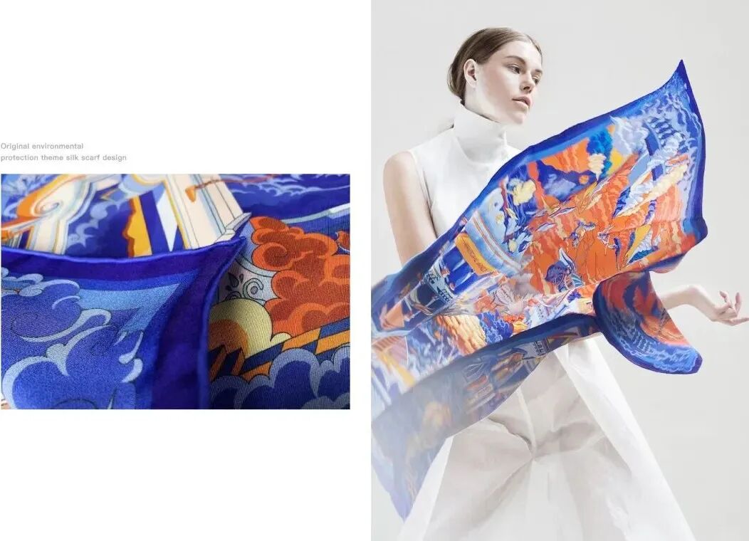 Color features: The “one pattern with two colors” design allows people to wear one same silk scarf with two different styles by simple folding. In doing so, it hopes to protect environment by save costs and reduce purchase. Material features: The scarf is made of PRET advanced material. It takes three years to develop environment-friendly fabrics from marine trash. Three pieces of plastic trash can be made into a silk scarf and six pieces can be made into a backpack. Starting from the utilized material, we combine technology and art to improve the ecological damage caused by marine trash, which verifies our original intention: remodeling. Market potential: According to the statistics of China's luxury consumption industry in 2021, if this work is priced 980 RMB, the profit of each product can reach 300% of its cost. Besides, this product is in line with China's sustainable development strategy. As a national support project, to a certain extent, some fixed costs such as costs on equipment can be reduced. Lifestyle: Ultimately, the purpose of products is not to make profits, but to call on the society to protect nature, respect nature, recycle the garbage abandoned by human beings in the sea, and create an infinite cycle of "product → recycling → product", so as to improve ecology as well as to shape a sustainable lifestyle.