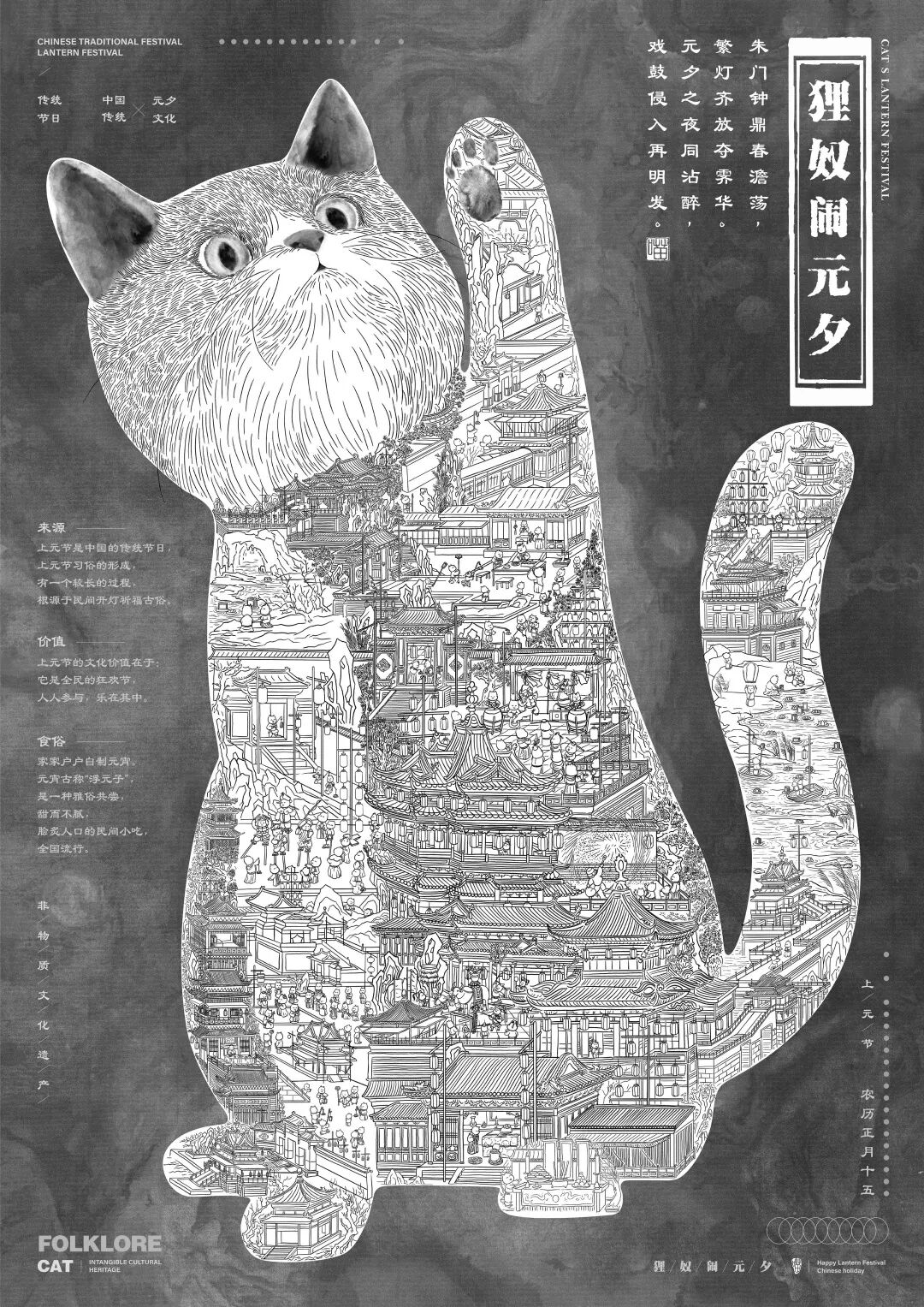 In ancient China, Yuanxi Festival, also known as Lantern Festival or Shangyuan Festival, was a very important festival. On this day, the royal family and the folks held festival activities such as watching the moon, lighting lanterns and guessing lantern riddles to pray for good luck. There was a romantic saying: in the eyes of cats, humans are all big cats. Therefore, this work guides us to Yuanxi Festival from the perspective of a cat. The Cat, as the protagonist, travels through the countryside, the city and the palace to celebrate the Festival, showing us a grand ancient Yuanxi Festival.