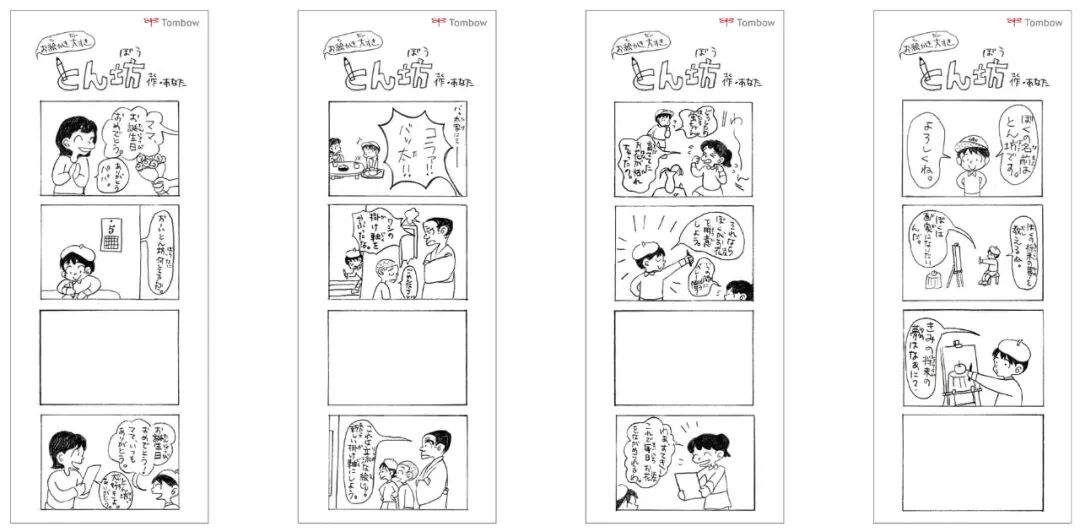 Tombow文具品牌广告:由根本崚佑、中村辽、冈田江里菜3人共同创作,挑战“Tombow Pencil(蜻蜓铅笔)”的广告作品获得了最高奖。他们用简单朴素、铅笔手绘的方式带出老牌文具品牌“蜻蜓铅笔”的清新和陪伴感,从右至左的4 帧漫画,分别是《我的未来梦想》、《别哭,萤火虫酱》、《バッ太,千钧一发!》以及《妈妈的生日》。
