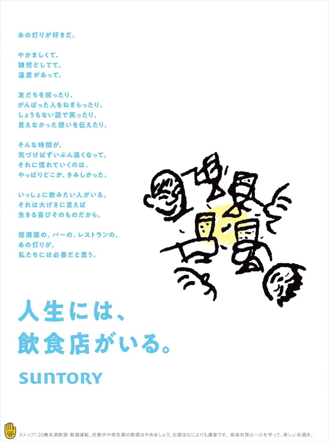 最后由SUNTORY 出版的15 版朝刊广告获得最高奖,评审照井晶博说到:“在这个社会上,人们往往被要求从各个方面发言,而此作品散发出一个每个人都能在餐厅里、一同举杯时感到陪伴和有所共感。我认为这是一个非常好的广告,包括插图的气氛。”