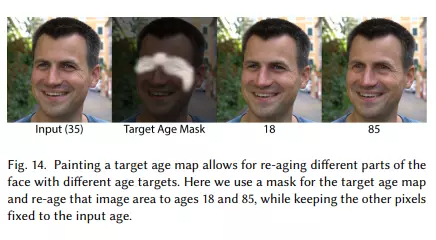 此外,这些输入年龄通道不一定是是恒定的,可以主观来推测年龄,然后用其他值进行填充,以控制脸部不同区域的re-age量。