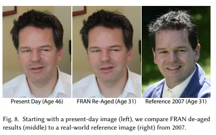 最后,研究人员将该re-age结果与现实世界的图像进行比较,两张相同人物的图像分别拍摄于2007年和2022年,直观来看该方法生成的re-age结果确实可以生成合理的目标年龄图像。