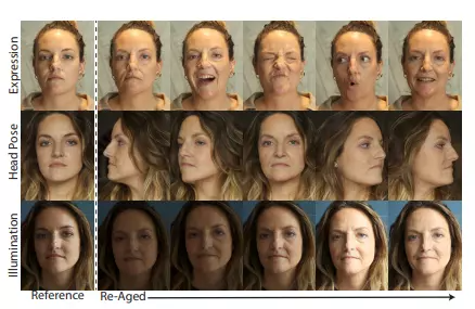 再将该方法应用于表情、头部姿势和光照的受控变化,可以进一步评估re-age年龄的一致性。