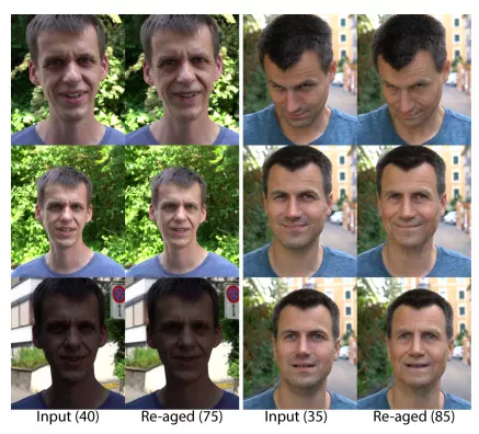 首先对几张静止的照片进行re-age,对于每张有估计原始年龄的输入照片,要求网络单独输出从20岁到80岁的不同年龄的图像,每10年变化一次。