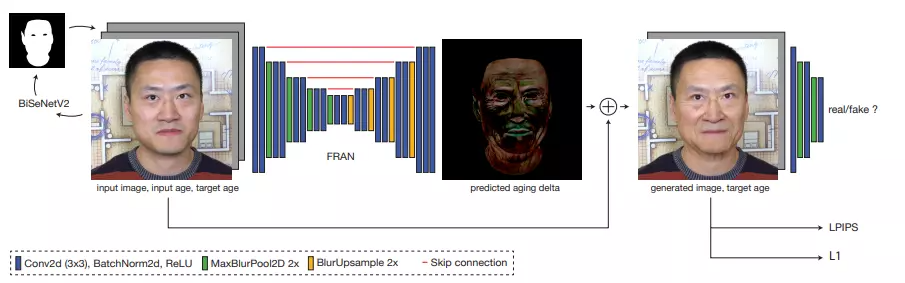 考虑到任务中图像到图像的翻译性质,研究人员为FRAN采用了熟悉和成熟的U-Net架构设计,并为翻译质量和re-age控制做了小的调整。