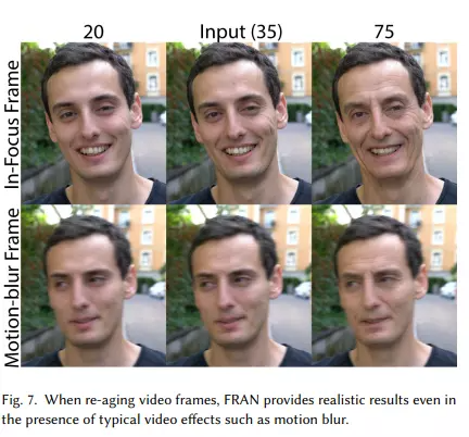 即便输入图像存在运动模糊等情况,该方法仍然可以正确输出re-age后的结果,这一特点使得用户可以很容易地将该网络应用于视频帧,而不需要预先或后期处理步骤,比如预先锐化或后期应用模糊过滤器来匹配原始镜头。