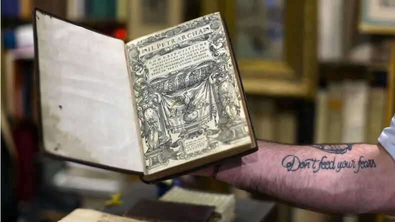 古董书商费德里科·布奇打开了弗朗切斯科·佩特拉卡的 16 世纪审查版作品,意大利威尼斯,2021 年。图片由Shubigi Rao提供。