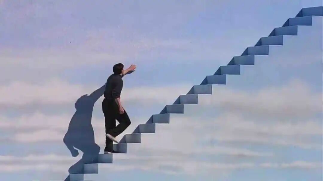 而其中最让人记忆犹新的,应该就是当楚门抵达蓝天白云的影棚边界,走上楼梯,即将离开这个虚假世界的画面。